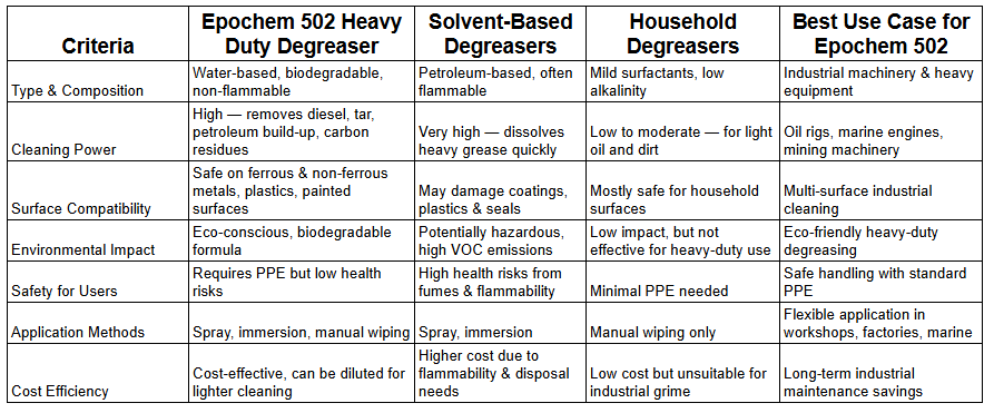 Match the Degreaser to the Job – Epochem 502 is ideal for heavy-duty cleaning in oilfields, marine, manufacturing, and automotive sectors.