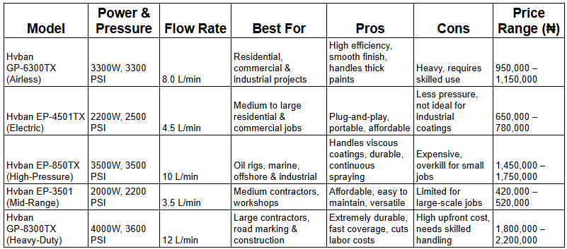 Choosing the right paint sprayer in Nigeria depends on project scale, paint type, and budget. Below is a professional comparison of the top five Hvban paint sprayers, covering specifications, suitability, pros and cons, and estimated prices in the Nigerian market for 2025.